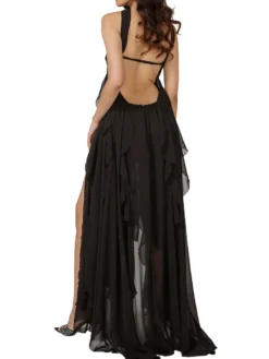 Solid color, ruched bust, decorative stars, halter neck and backless, floor length, irregular ruffled hem design, cocktail party dress, easy to show your charming curves, comfortable for you all day long.