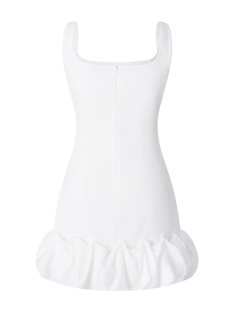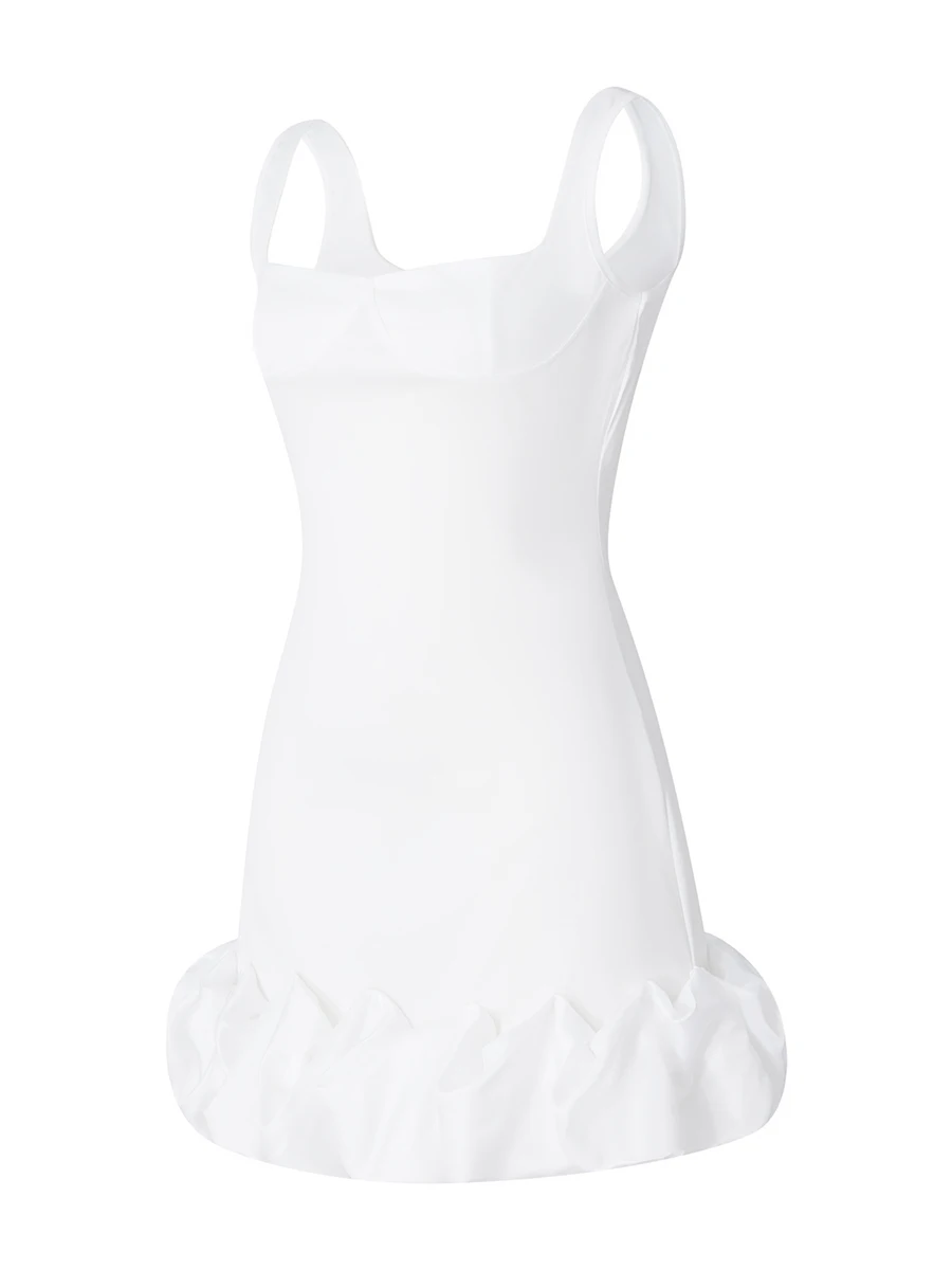 Women Spaghetti Strap Bodycon Dress Solid Color Pleated Ruffle Hem Sleeveless Party Dress for Cocktail Nightclub Beach